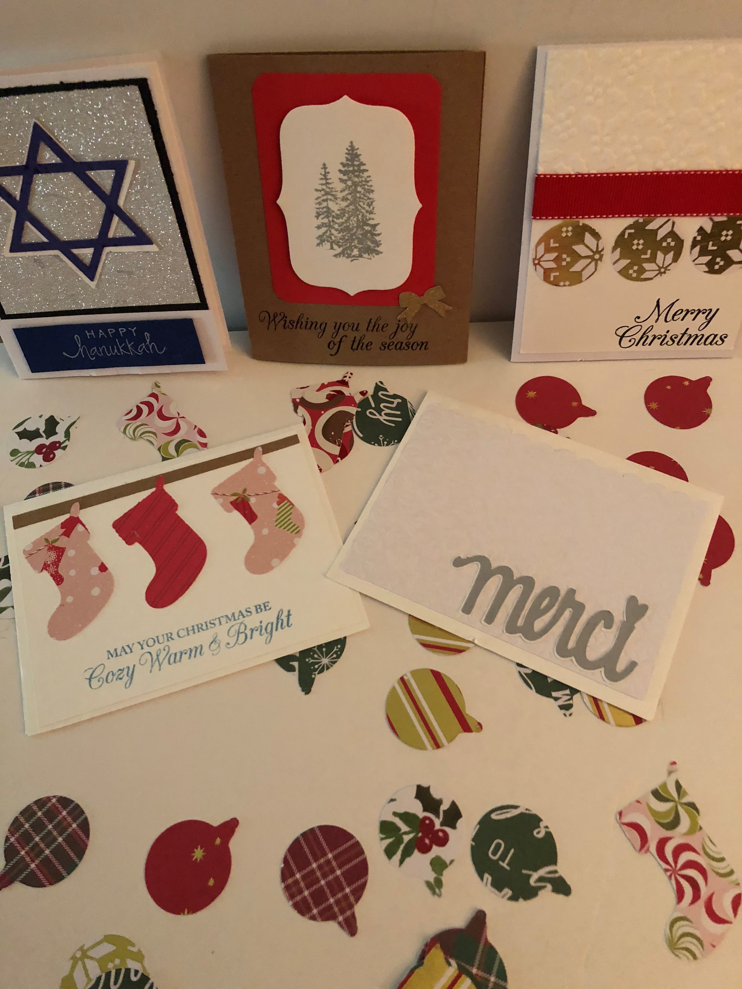 As you can see from the cards, I have 3 Christmas, 1 Hanukkah, and 1 thank you. My reasoning for having a thank you card is that people always need them but don’t have them on hand. This way they can plan for the holidays and get a couple thank you cards to have at the ready. If I have time (and I don’t think I will), I will also add a generic birthday card.