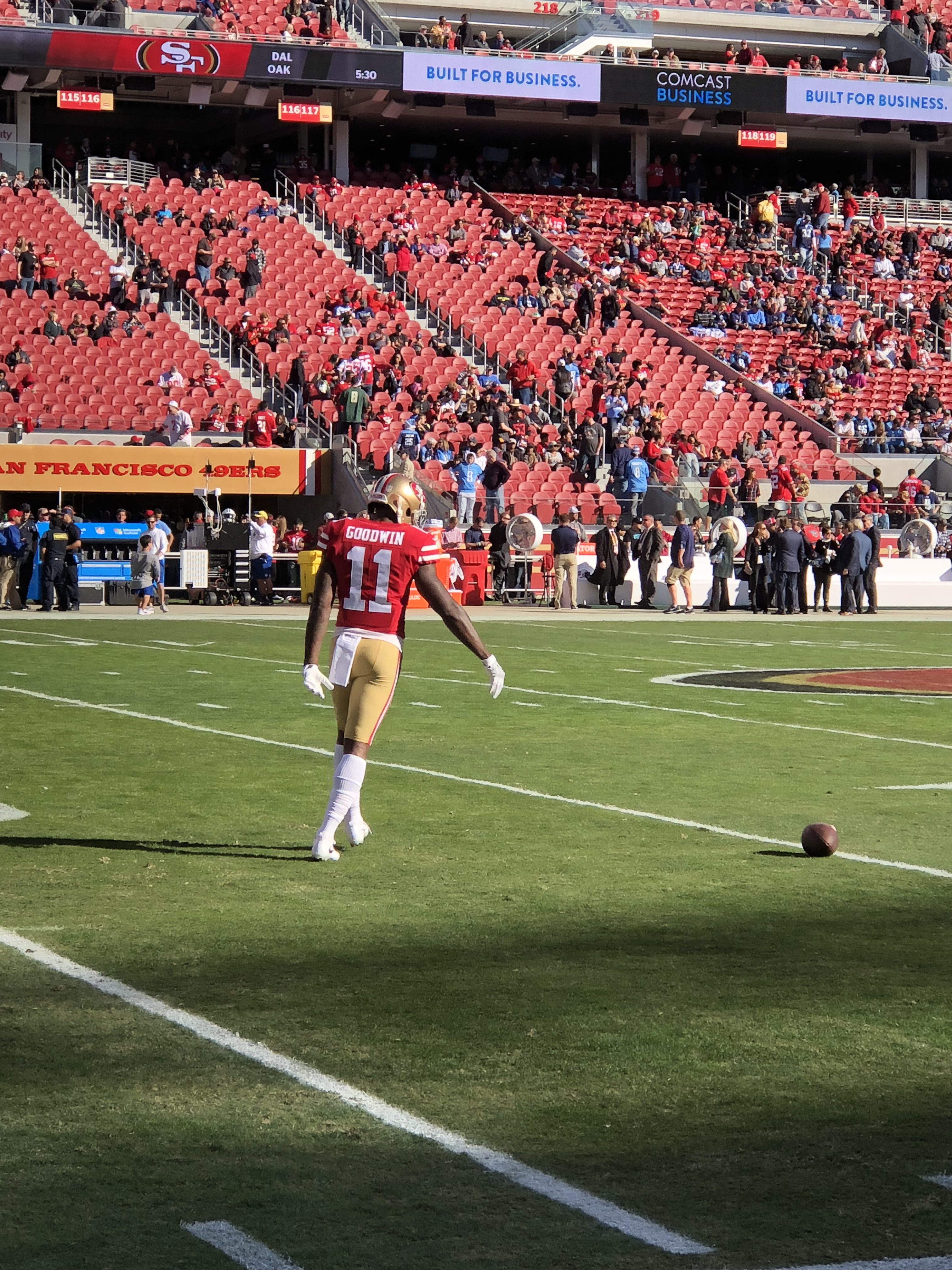 As if that wasn’t enough, we were then given passes to go down onto the field before the game!! It was as if Santa himself gave me the pass. This was how excited I was. We got to watch the players warm up and I even said hello and got an acknowledgement from Jed York (CEO of the team).
