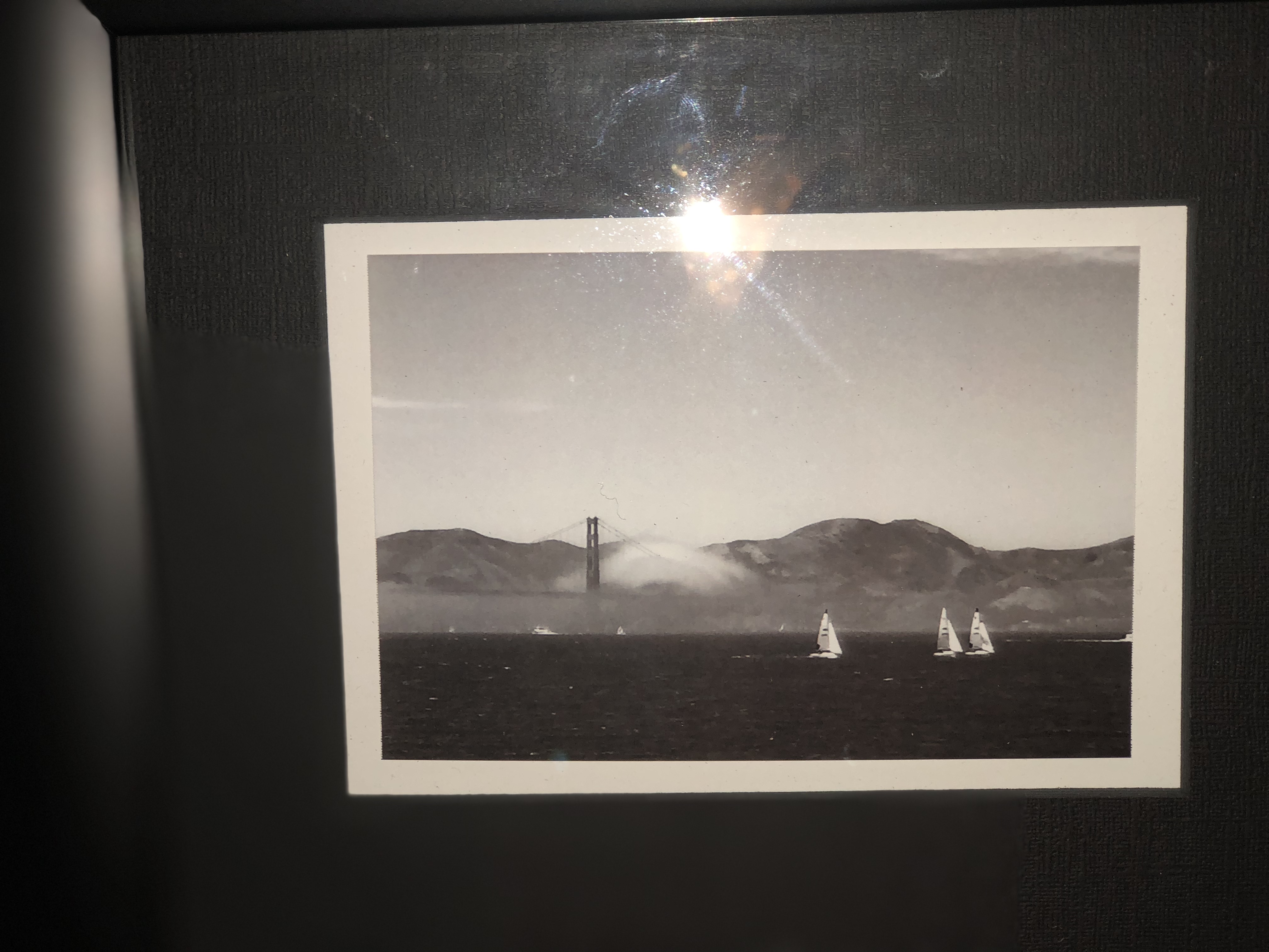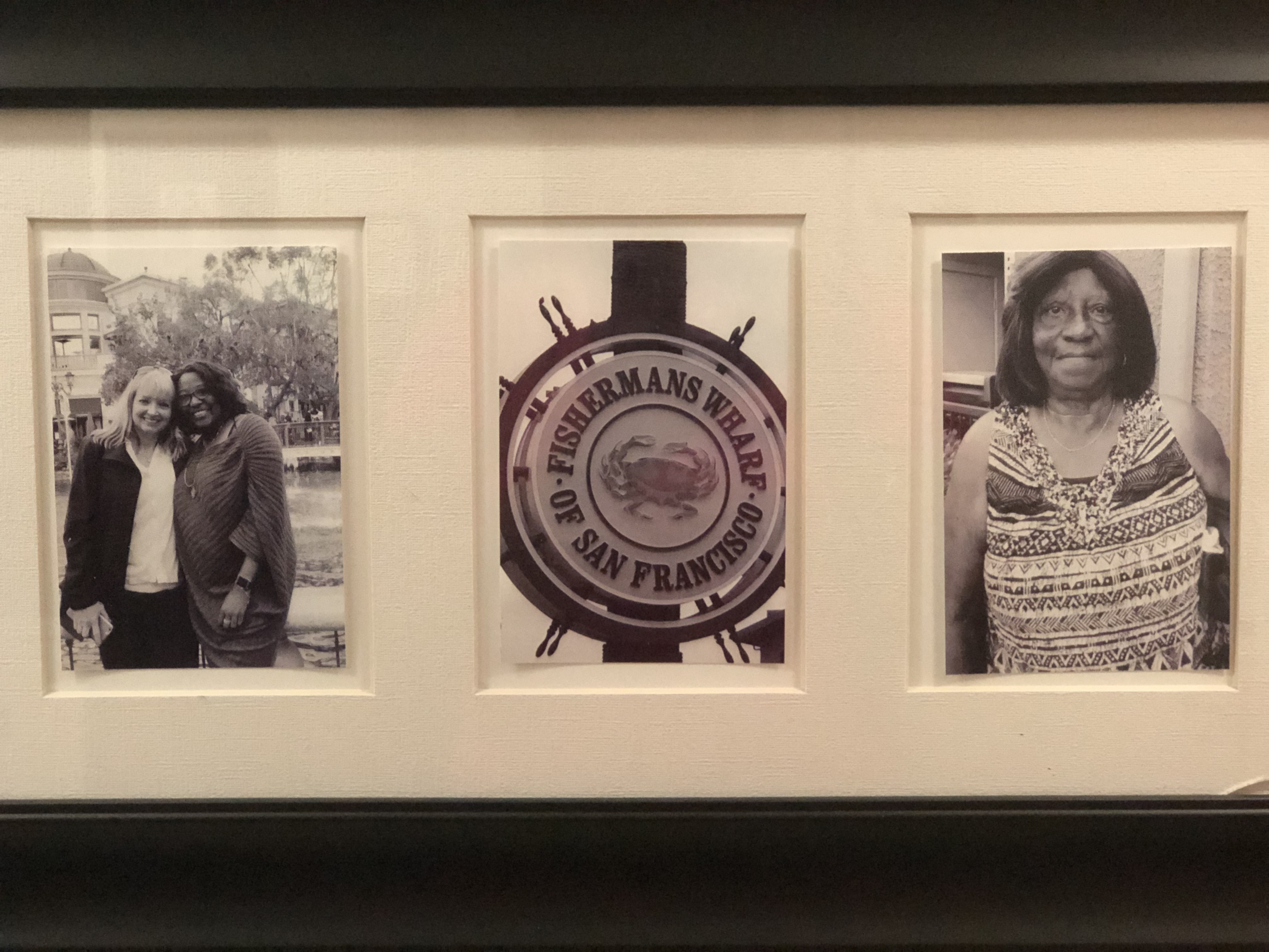 This horizontal collage contains a photo with my friend, Michele, a photo of the famous Fisherman’s Wharf wheel, and a family photo with me, my baby sister, my aunt, my niece, and my mom. The final photo is of the San Francisco Bay with sailboats on the water and fog settling over the Golden Gate Bridge.